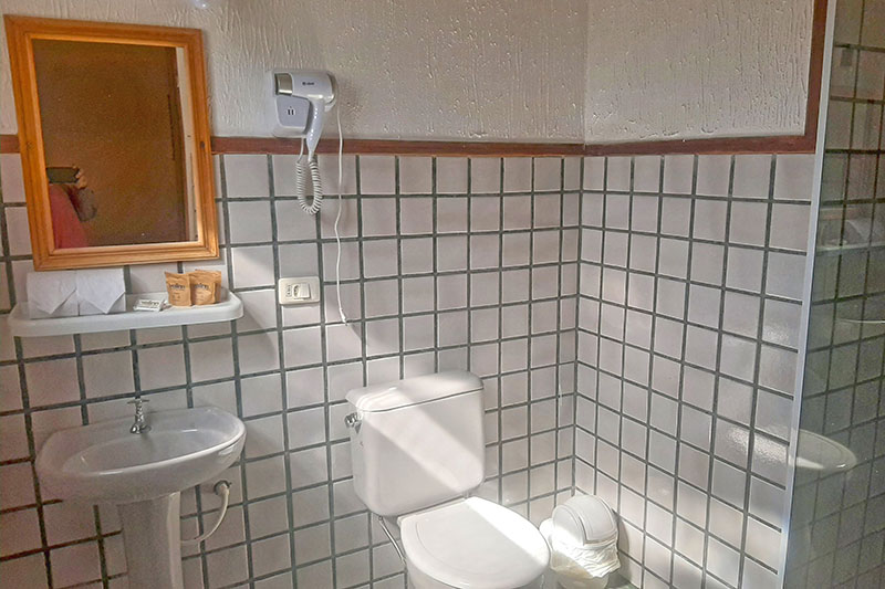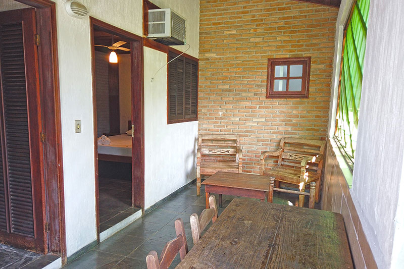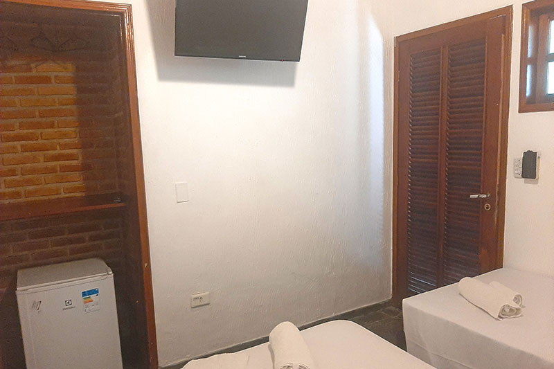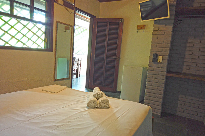 Ampla sala com cozinha americana equipada, geladeira duplex, microondas, fogão, 01 suíte com cama de casal, Tv e ar condicionado e banheiro com box blindex, 01 suíte com cama de casal, TV, varanda e 01 quarto com cama de casal e banheiro com box blindex e varanda exclusiva com vista para a piscina.